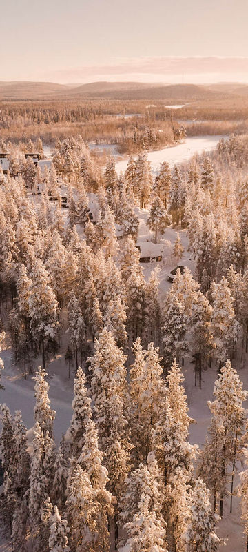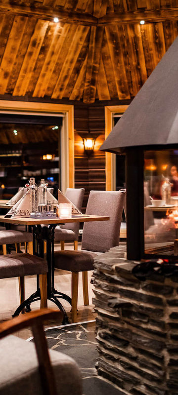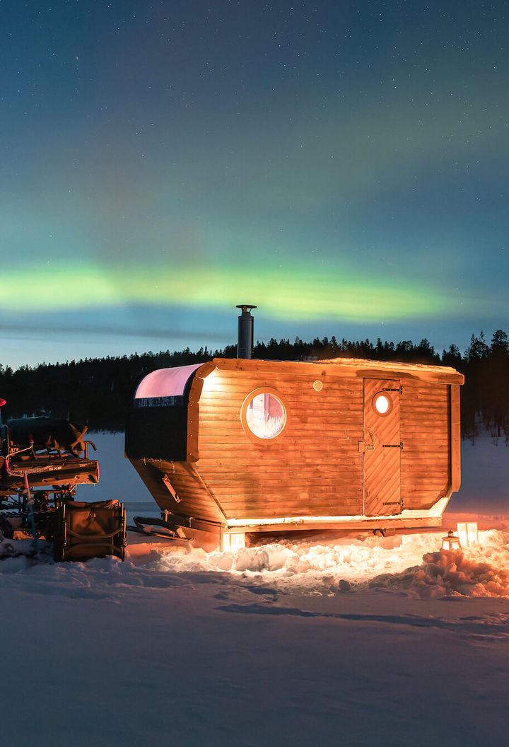 For those who prefer a multilevel stay, the Aurora Tower is a two storey wooden cabin with the bedroom upstairs beneath a large roof window, complete with a kitchenette, dining area and cosy lounge.