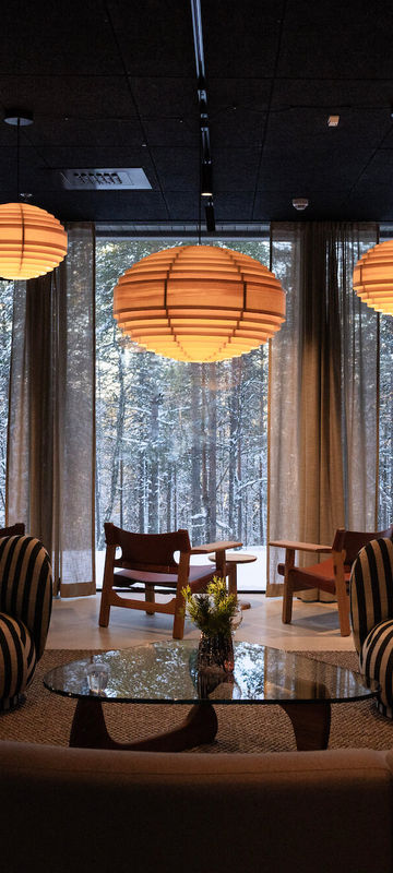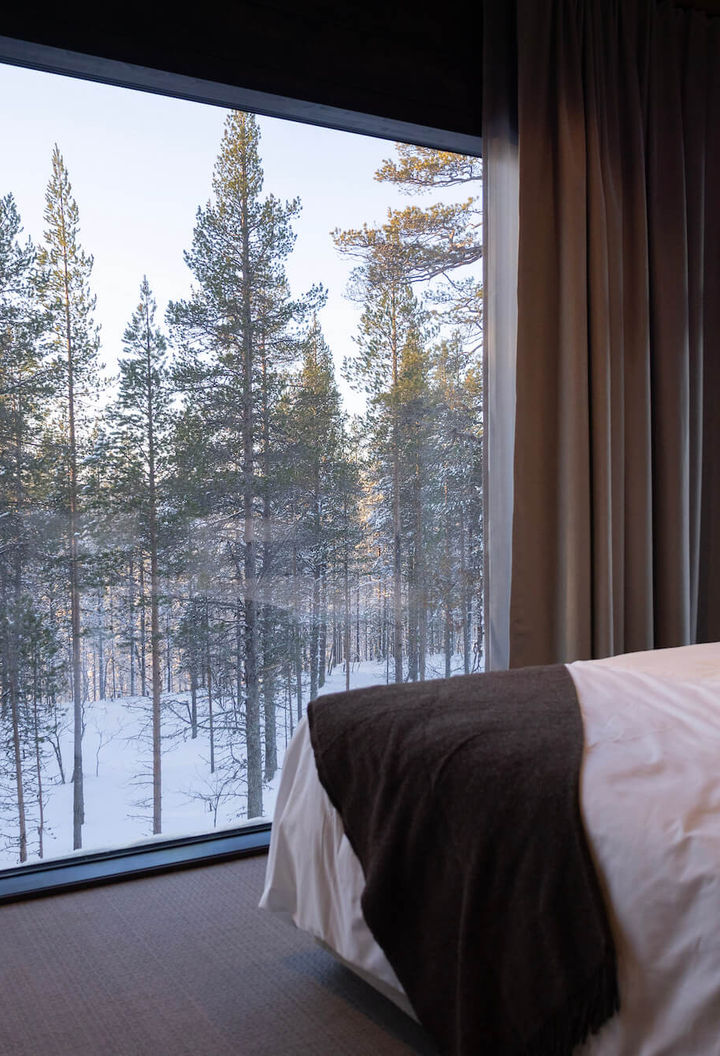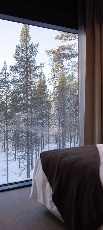 The Premium Room is a spacious retreat where you can relax in modern comfort and soak up the magic of Lapland. Floor to ceiling windows frame either the tranquil snowy forest or above the Arctic tree tops. From the warmth of a plush bed, you can unwind in a setting where nature’s beauty is always within view.