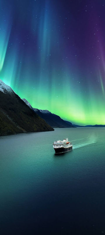 Chances to glimpse green in the night sky mean travelling between September and March. And to maximise your chances of seeing the lights, opt for the classic round voyage, Bergen-Kirkenes-Bergen. Away from light pollution, with an aurora alert on board as you sail into north you’ll be perfectly positioned to see the northern lights should they appear. Knowing you can step out on deck at a moments notice is reassuring with a phenomenon as fickle as the aurora. And should you be blessed with a extended display, you can cosy up in the observation lounge, watching the display through the glass ceiling.