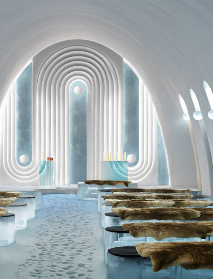 Sketches for this year’s art suites have been revealed together with an impressive new main hall. Step into a world of ice and snow into Cathedral Grove, the dazzling new entrance hall. Spend the night in the eye of the storm, drift away in an Arctic library or feel the cosmic power of a black hole in Spaghettification. And be captivated by the latest Icehotel ceremony hall.