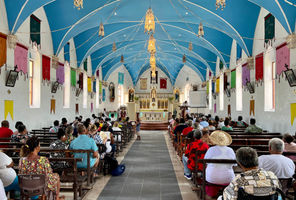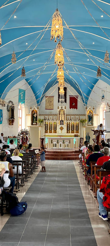 Rikitea, the charming capital of the Gambier Islands, welcomes you with the sparkling blue-green lagoon known for its black pearls. Enjoy a colourful flower greeting and taste local specialities at Karorua Quay. Don’t miss the renovated Saint-Michel Cathedral, a Polynesian Catholic landmark decorated with intricate mother-of-pearl.