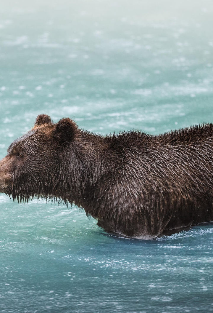 From Klahoose Wilderness Resort, a scenic hour-long boat ride takes you to the stunning Toba Inlet, a dramatic landscape of towering glaciers and cascading waterfalls. Deep within the Toba Valley, purpose-built bear-viewing stands are nestled among lush temperate rainforest, overlooking the glacier-blue waters of the Klite River. Each August, thousands of salmon return to spawn, attracting numerous grizzly bears as they prepare for winter hibernation.